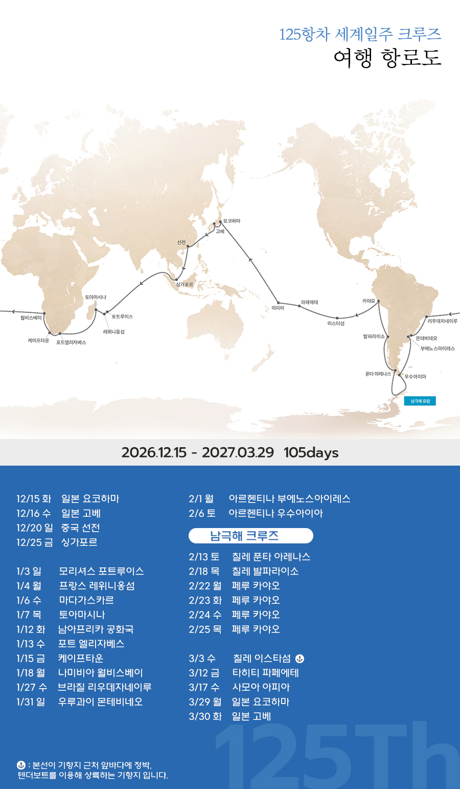 - 항해일정은 선장 및 선사의 판단에 의해 변경될 경우가 있습니다. 본 여행은 지구를 일주하는 장기간의 여행으로 천재지변, 정치상황의 악화, 현지 관리의 명령 등, 예기치 않은 상황이 발생한 경우 승객의 안전을 최우선으로 생각하여 사전에 (혹은 긴급상황의 경우 변경 후) 고객에게 공지하고 여행의 일정 및 서비스의 내용을 변경할 수 있습니다.