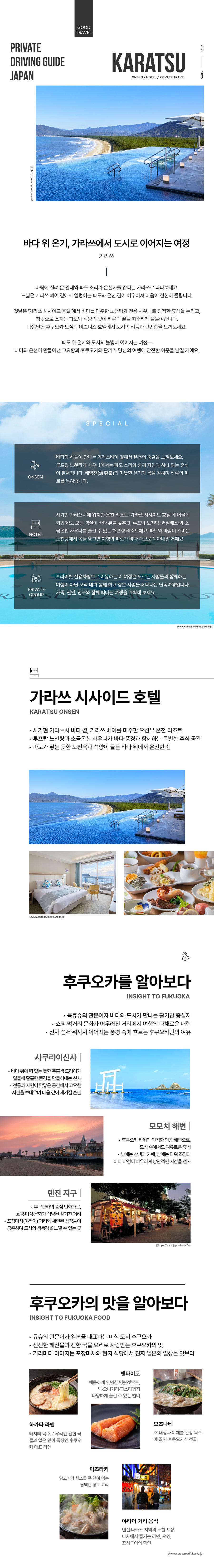 2019년 12월에 전면 리뉴얼을 통해 다시 태어난 가라쓰 시사이드 호텔. 특히 리모델링을 하며 중시한 것은 아름다운 겐카이만의 오션뷰를 충분히 활용하여 쾌적한 리조트 호텔을 지향하는 것이였습니다. 특히 옥상에는 수온 36~38도 정도의 천연온천을 사용한 1300여미터의 풀을 선보이며 수영복을 입고 온천풀에서 바다를 바라보며 온천도 하고 휴식도 취할 수 있는 멋진 포토스팟 겸 휴식의 공간을 만들어냈죠.