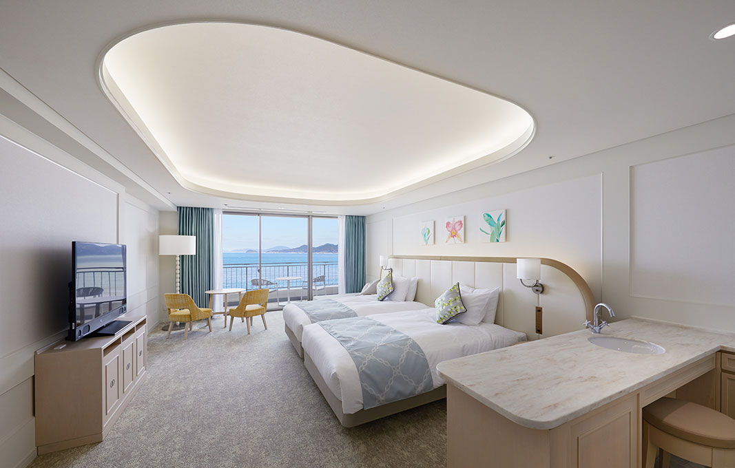 호텔은 기존의 오션뷰보다 더 넓은 통창을 사용하여 해상국립공원인 겐카이만을 멀리 조망할 수 있고 전반적으로 화이트색조로 구성되어있으며, 꿀잠을 잘 수 있는 시몬스 베드까지 준비되어서 여행자들에게 편안한 휴식을 제공하고 있습니다.