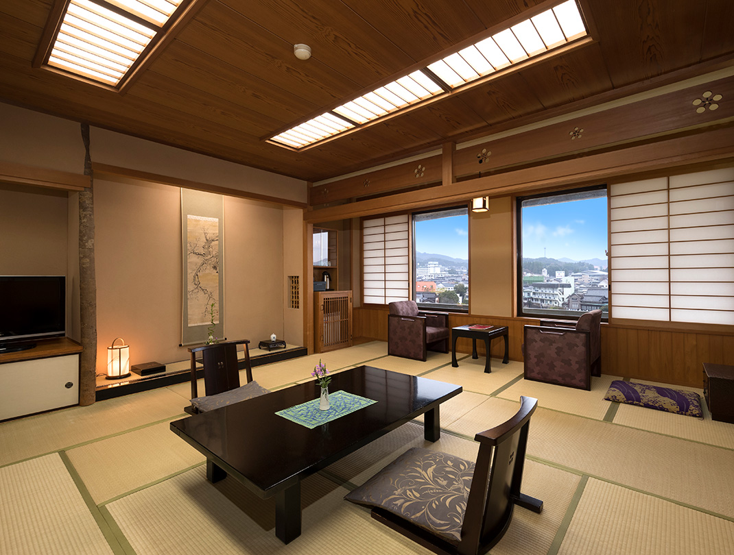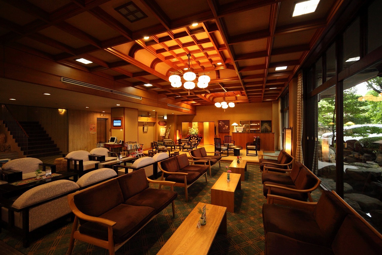 차분하고 낮은 톤의 료칸의 로비, 오붓하게 갖춰진 로비 한켠의 차와 공예품을 전시하고 판매하는 공간까지 더할나위 없는 깔끔함을 갖추고 있어 차분하게 마시는 일본의 차문화 그대로가 녹아있는 료칸입니다. 우레시노를 들르는 가족이나 커플 여행에 깔끔하고 수준 있는 접객을 느낄 수 있는 료칸으로 평가를 받고 있는 곳입니다.