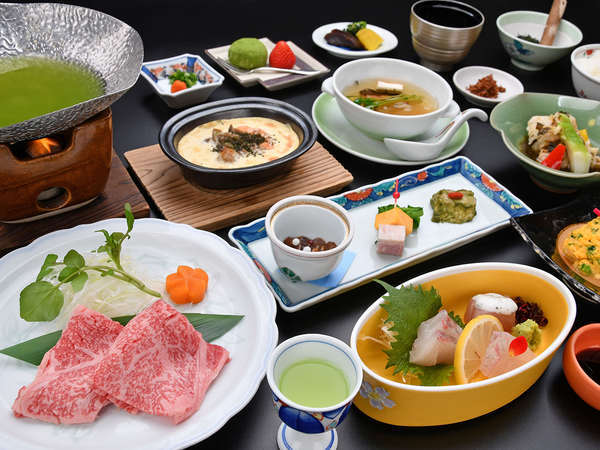 우레시노의 차를 중심으로 하는 료칸 답게 사가의 와규를 포함하여 우레시노 녹차를 이용한 샤브샤브 등을 준비하는 등 차의 효능을 듬뿍 활용하는 계절 식재료를 활용한 가이세키를 맛보며 료칸다운 맛과 멋을 느껴볼 수 있습니다.