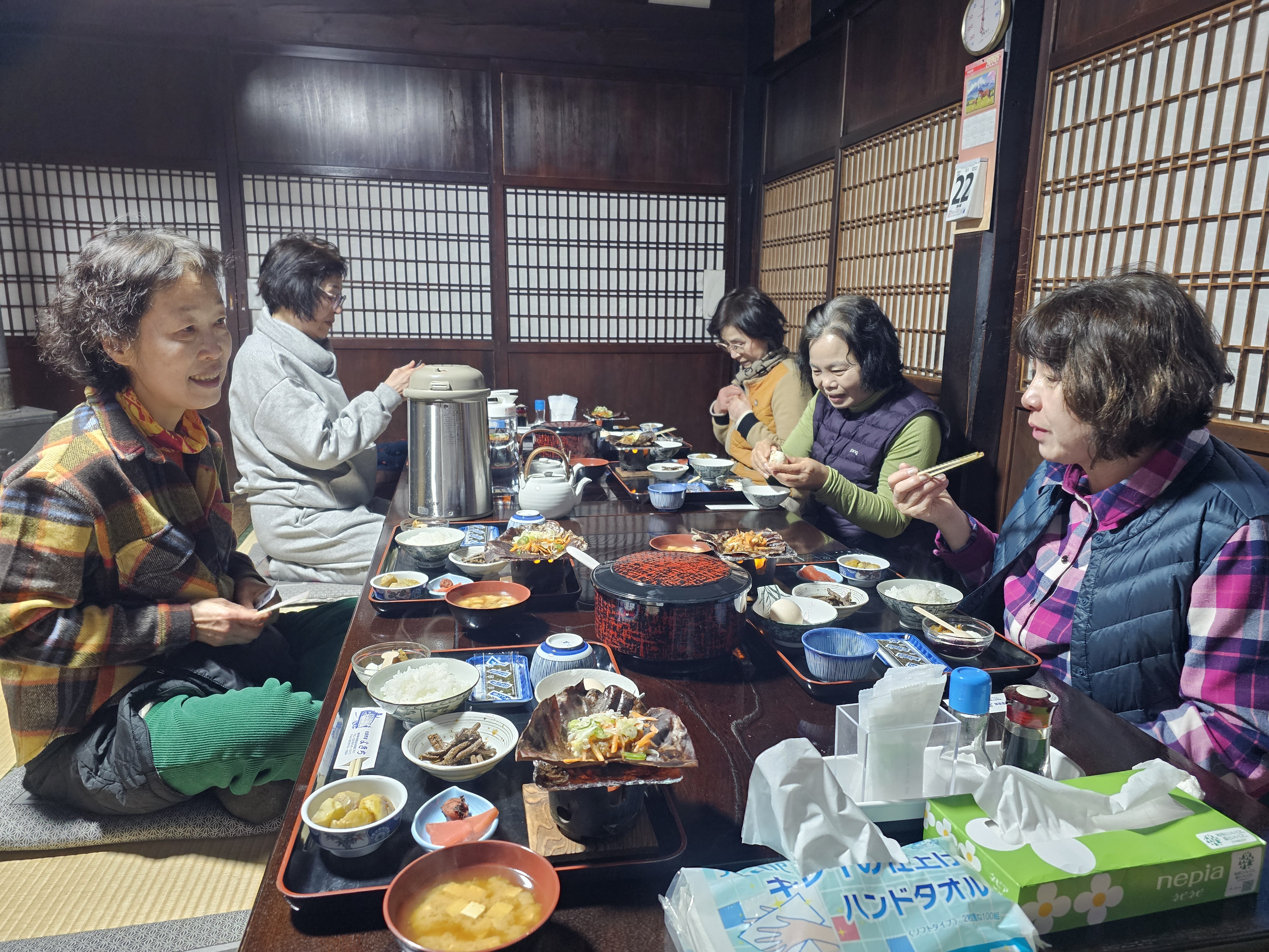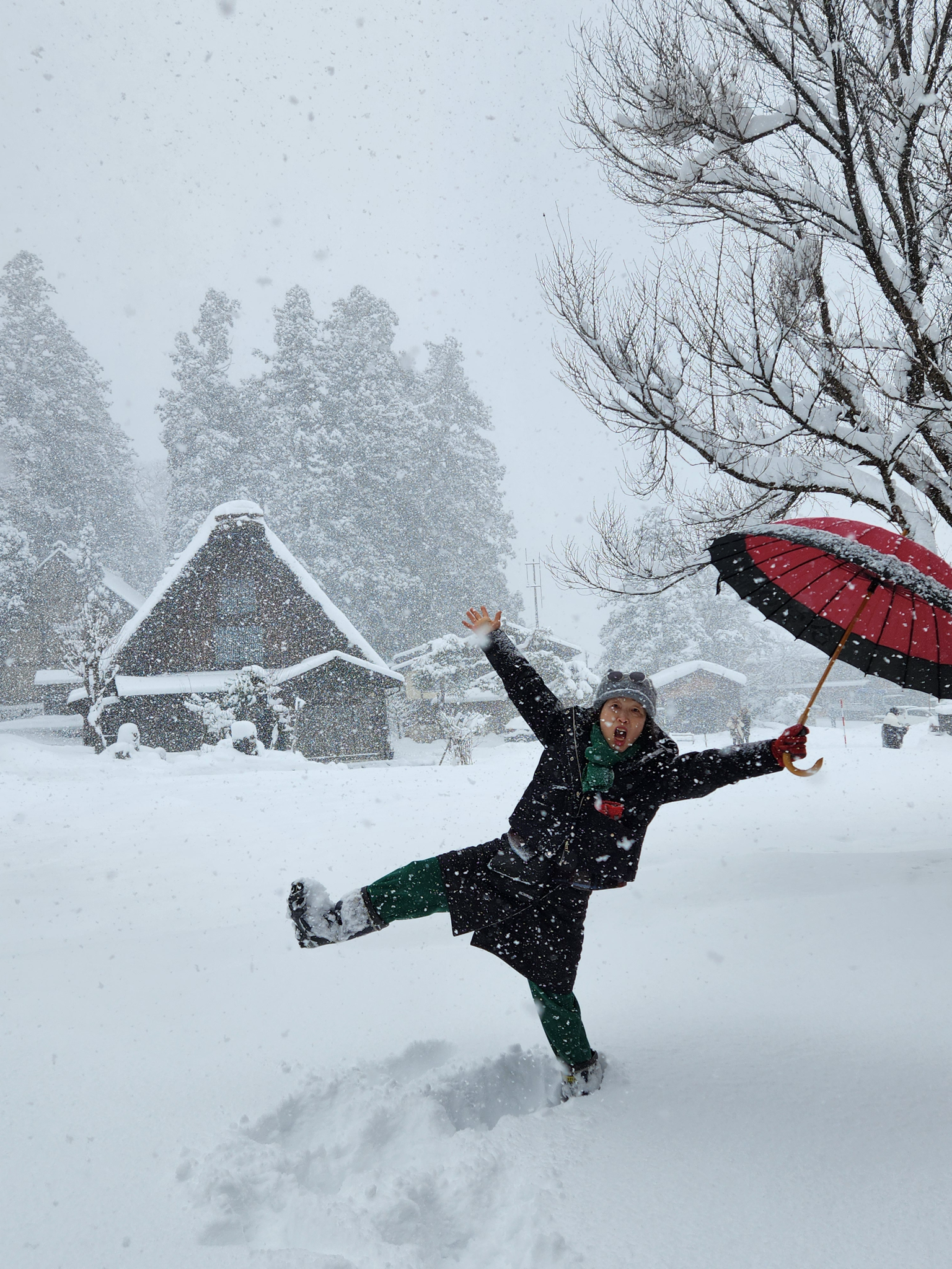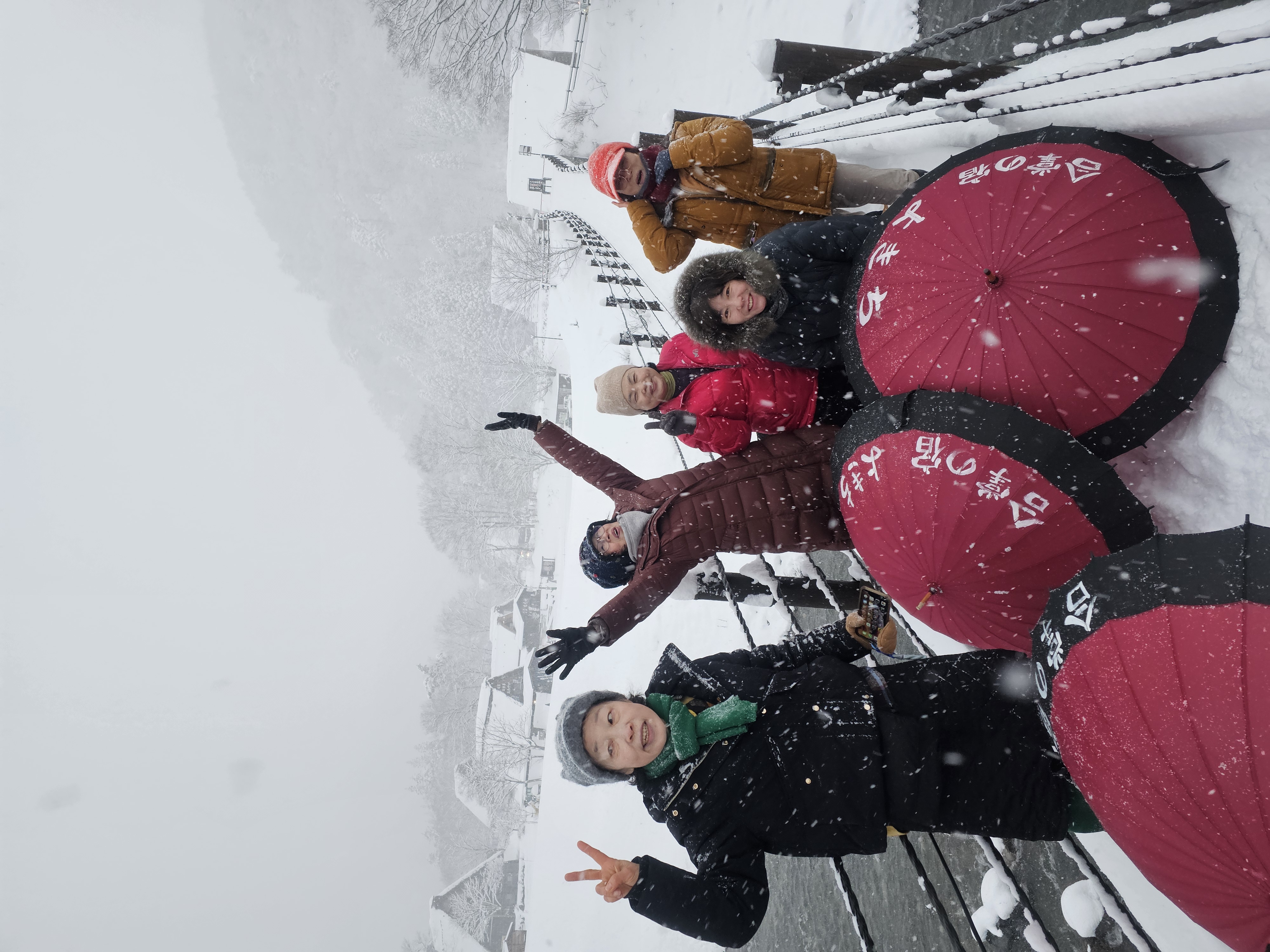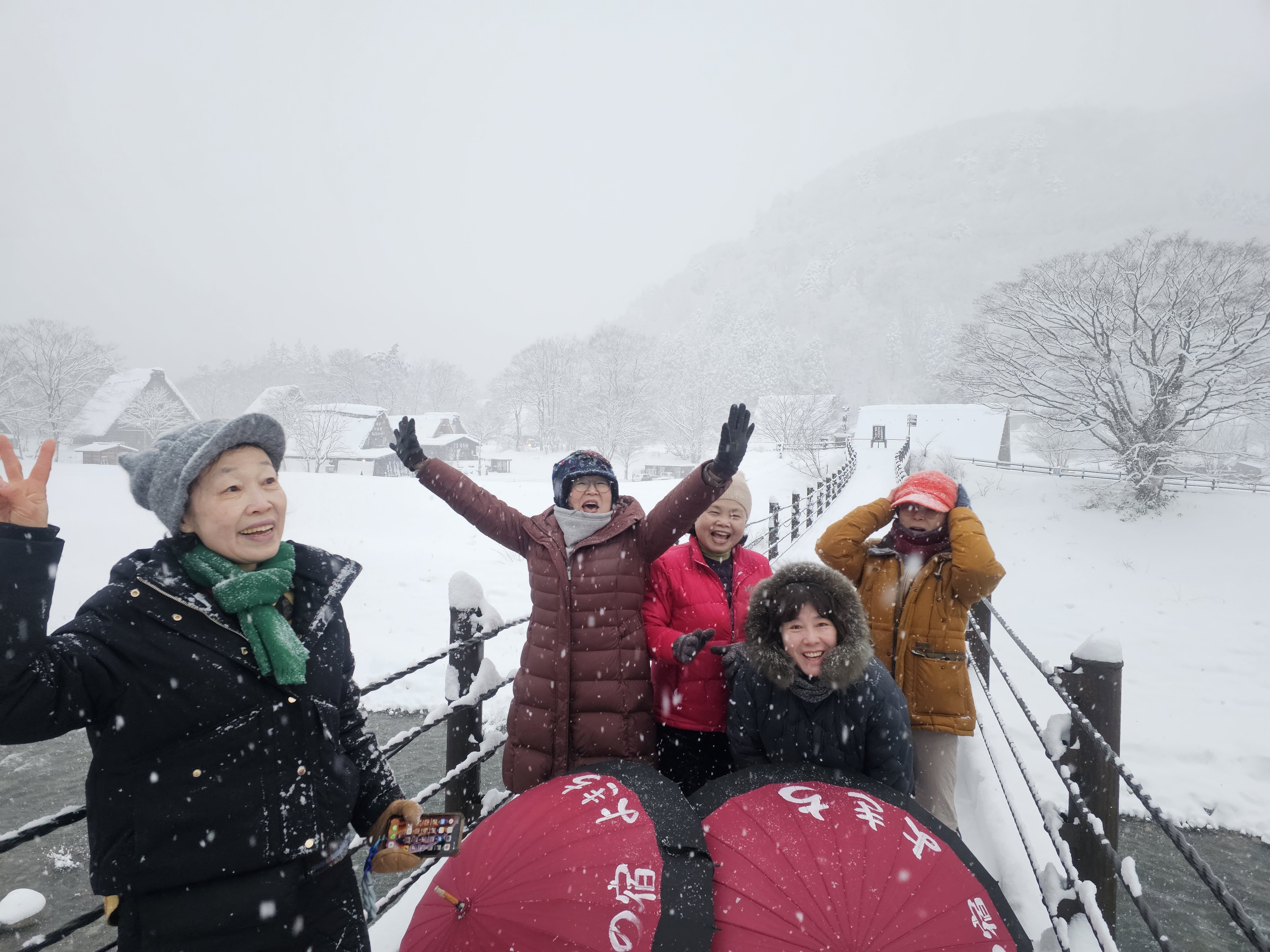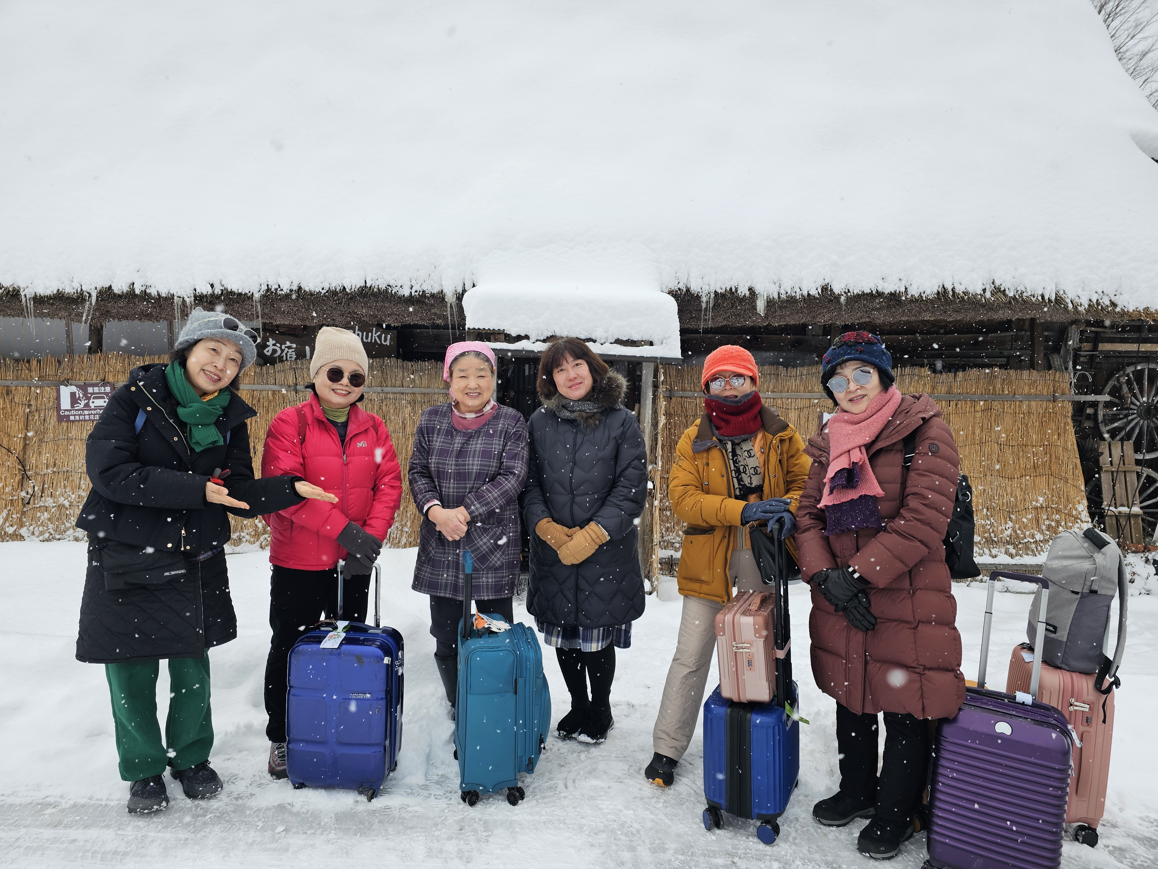 하얀 눈이 내리는 시라카와고를 배경으로, 또 마음이 따뜻해지는 단팥죽 할머니 가게에서