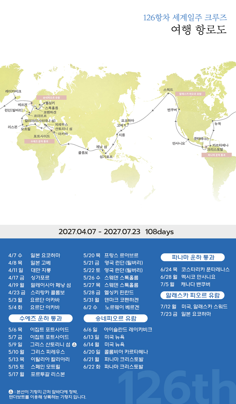 - 항해일정은 선장 및 선사의 판단에 의해 변경될 경우가 있습니다. 본 여행은 지구를 일주하는 장기간의 여행으로 천재지변, 정치상황의 악화, 현지 관리의 명령 등, 예기치 않은 상황이 발생한 경우 승객의 안전을 최우선으로 생각하여 사전에 (혹은 긴급상황의 경우 변경 후) 고객에게 공지하고 여행의 일정 및 서비스의 내용을 변경할 수 있습니다.